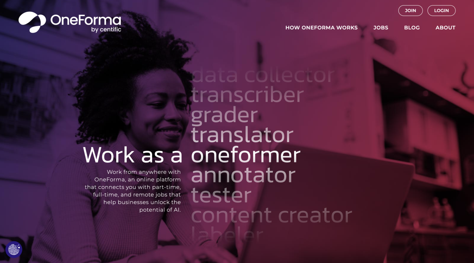 OneForma es una plataforma en línea que conecta a personas con trabajos a tiempo parcial y remotos. Si estás interesado en trabajar desde cualquier lugar y deseas utilizar tus habilidades de idioma, investigación y tecnología para ganar ingresos adicionales y certificarte en tecnología, ¡puedes unirte a la comunidad de OneForma hoy mismo!